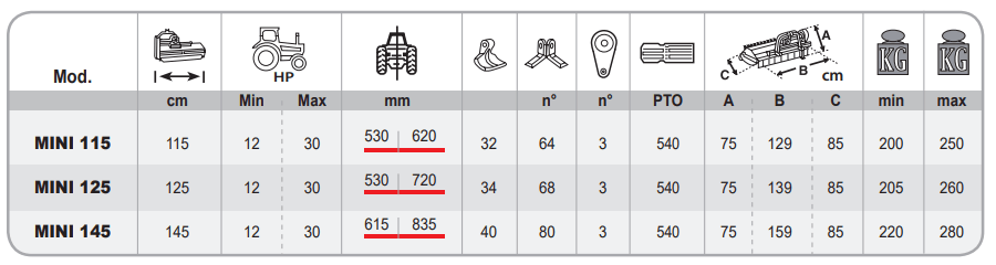Standard equipment: fixed and reversible 3-point linkage Cat. I, adjustable rear roller Ø 114, free wheel in the gearbox, forged and hardened BERTI hammers (or blades), PTO 540 rpm.