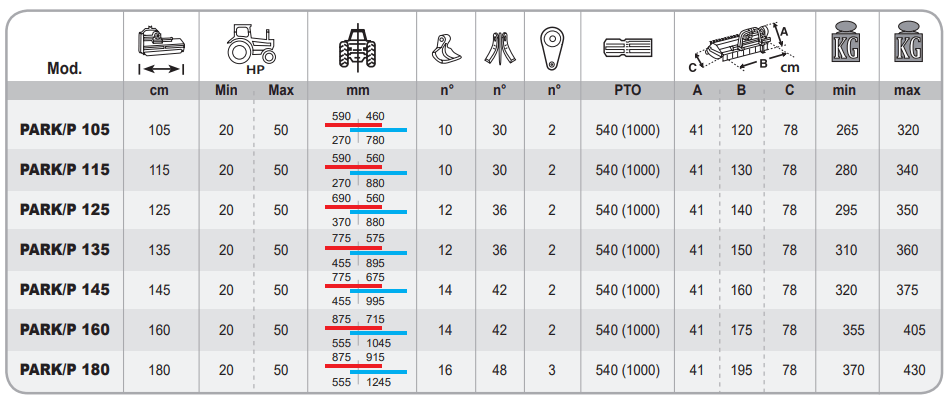 Standard equipment: displaceable 3-points linkage, Cat. I, mechanical side shift, counter-blades, free wheel in the gearbox, height adjustable self-cleaning levelling roller ø 139, forged and hardened BERTI hammers or blades, PTO 540 /1000 rpm (reversing the pulleys).