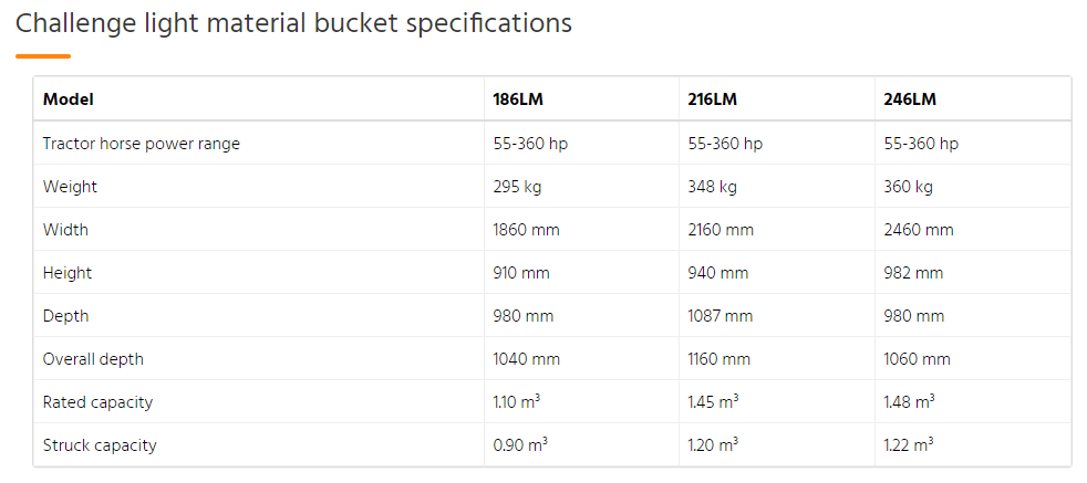 The three Challenge light material buckets have different rated capacities and offer different widths in comparison to our Challenge general purpose buckets. They have been developed to handle larger volumes of lighter material. The Challenge light material bucket has the same features as the Challenge general purpose bucket with the addition of internal ribs near the attachment lugs for extra strength in the back of the bucket.