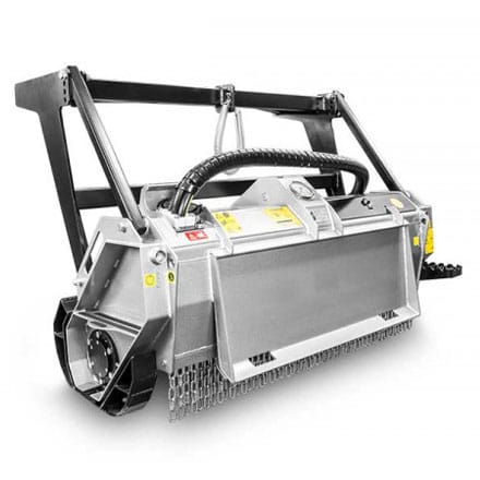 This skid steer brush mulcher is the entry level model in the fixed tooth line of forestry mulchers.