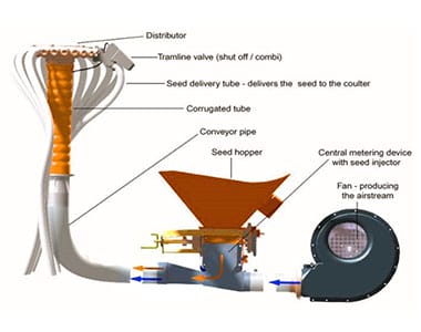 - The central, totally enclosed cell wheel of the metering device accurately measures the required volume of seed and discharges it into the venturi cone where it is mixed with the air stream and then conveyed through the diffuser tube and the seed delivery hoses to the coulters.
