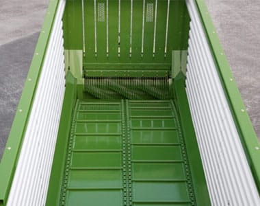 - The mobile ejector wall at the front inclines and pushes the material until it topples, supporting the chain-and-slat floor.
